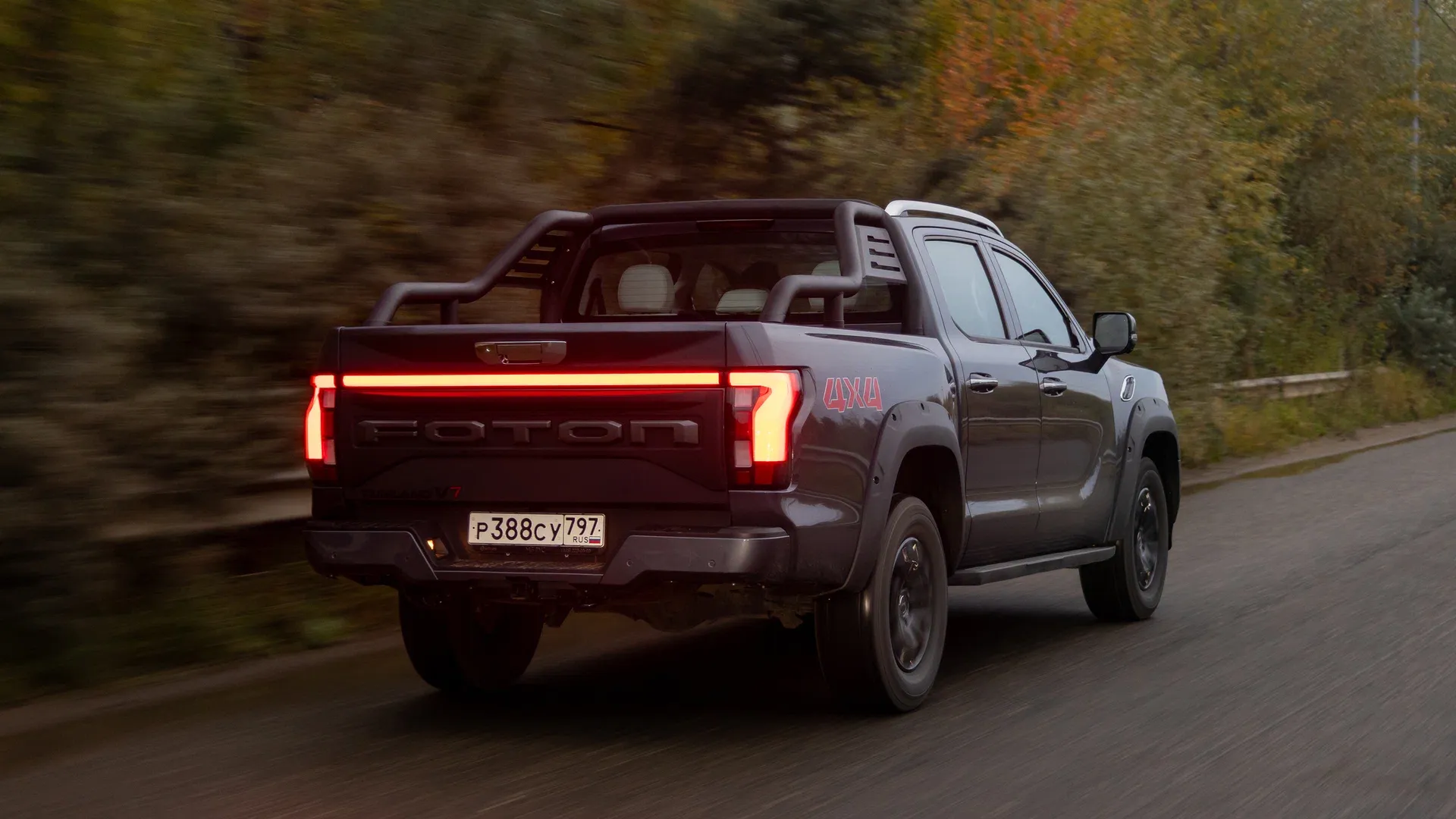 Впрочем, и сам V7 — тот ещё пижон. Накладки на арки, нарочито прикрученные болтами, щёгольская (но бесполезная) дуга безопасности в кузове, диодная полоса между фонарями в дополнение к выштамповке FOTON во весь борт. Плюс обильно облитая хромом решётка радиатора.